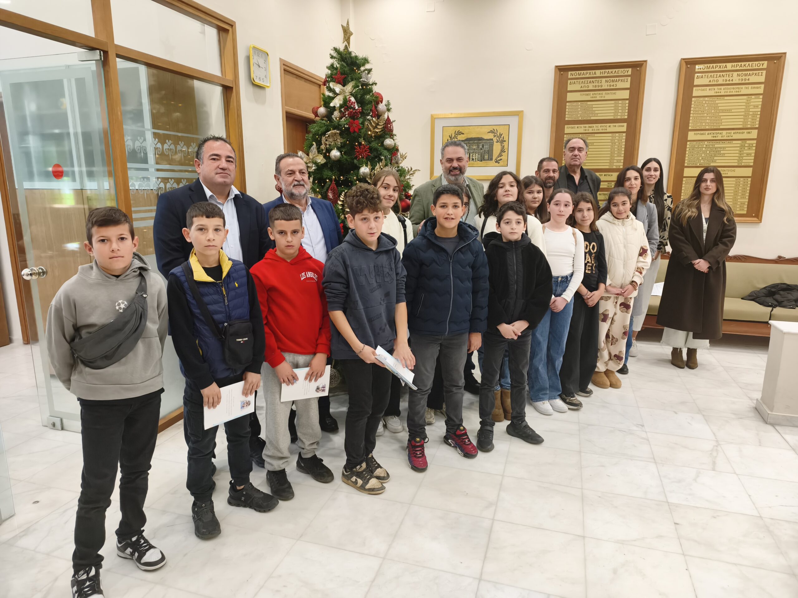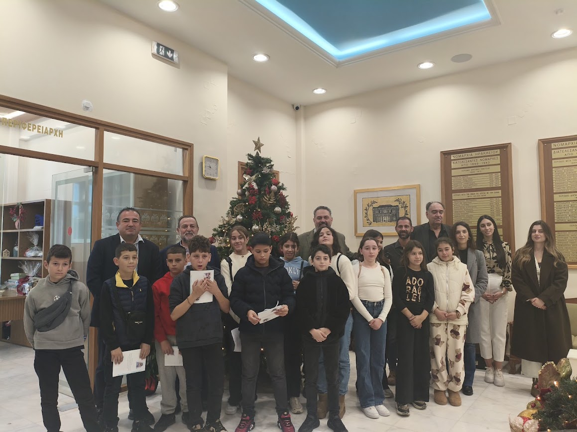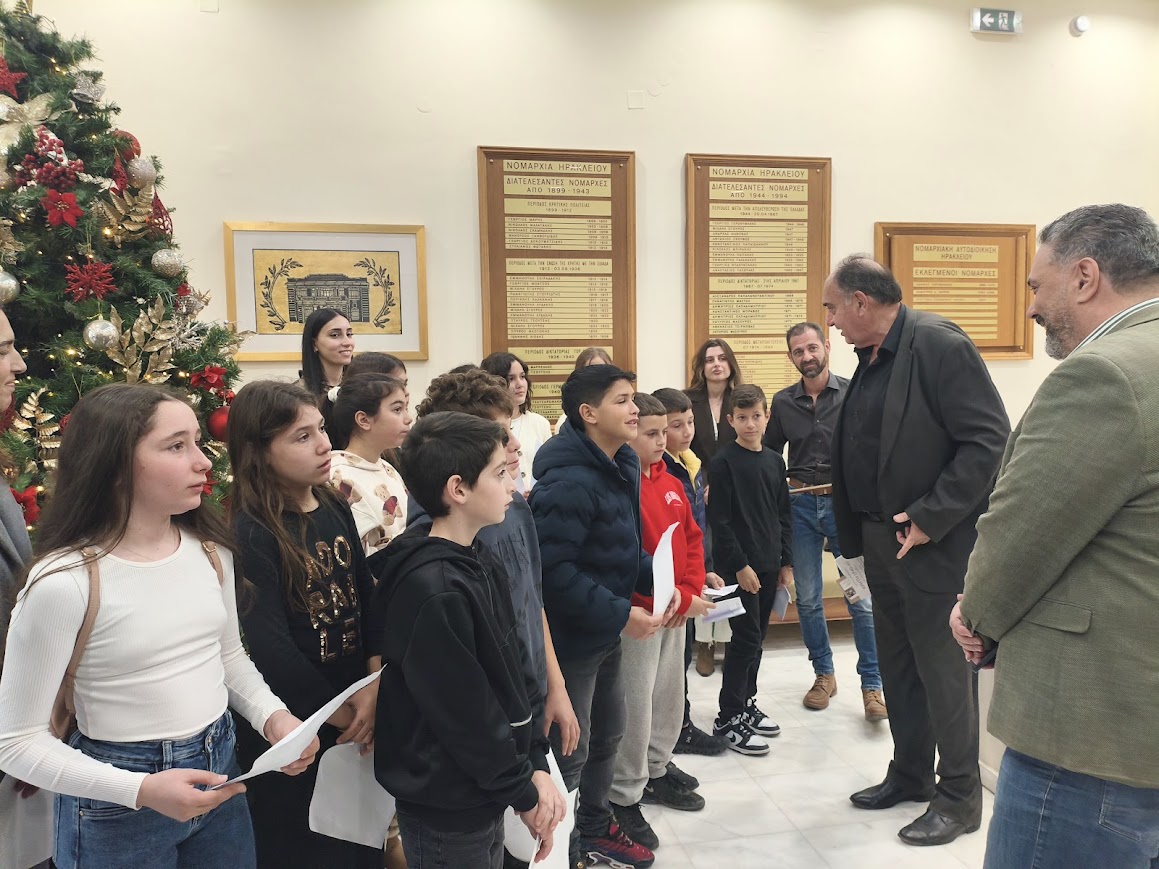 Τους μαθητές υποδέχτηκαν στην Περιφέρεια Κρήτης ο Αναπληρωτής Περιφερειάρχης Γιώργος Πιτσούλης, ο Αντιπεριφερειάρχης Ηρακλείου Νίκος Συριγωνάκης, η Εντεταλμένη Περιφερειακή Σύμβουλος Παιδείας Δια Βίου Μάθησης Ελένη Μαράκη-Μπελαδάκη, η Πρόεδρος της Αγροδιατροφικής Σύμπραξης Περιφέρειας Κρήτης Ειρήνη Χουδετσανάκη και ο ειδικός σε θέματα ιστορίας και μνήμης Θυμάτων Ολοκαυτωμάτων Νίκος Μπιμπάκης.