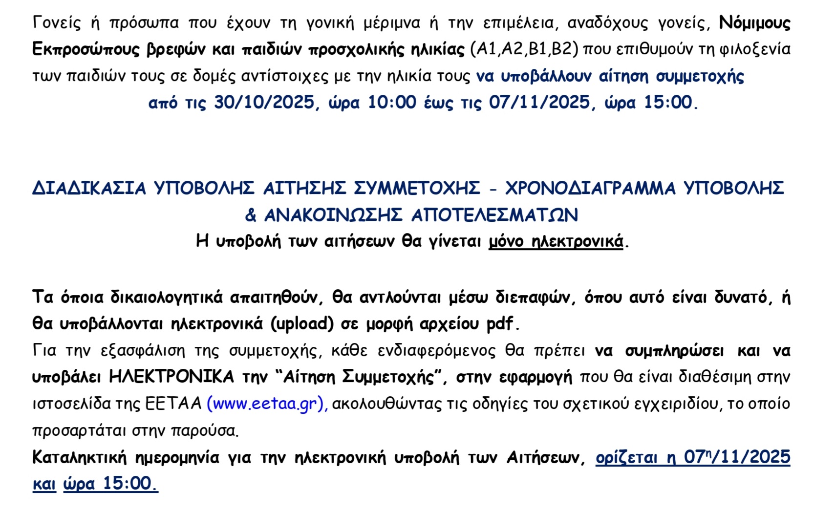 👉Ξεκίνησε η υποβολή αιτήσεων για τη Β’ Πρόσκληση του προγράμματος voucher παιδικών σταθμών, δίνοντας δεύτερη ευκαιρία σε χιλιάδες γονείς που είχαν μείνει εκτός κατά την πρώτη φάση. Η διαδικασία θα παραμείνει ανοιχτή έως και την 7η Νοεμβρίου 2025 και αφορά το πρόγραμμα «Προώθηση και υποστήριξη παιδιών για την ένταξή τους στην προσχολική εκπαίδευση και για την πρόσβαση παιδιών σχολικής ηλικίας, εφήβων και ατόμων με αναπηρία σε υπηρεσίες δημιουργικής απασχόλησης» για το σχολικό έτος 2025-2026.