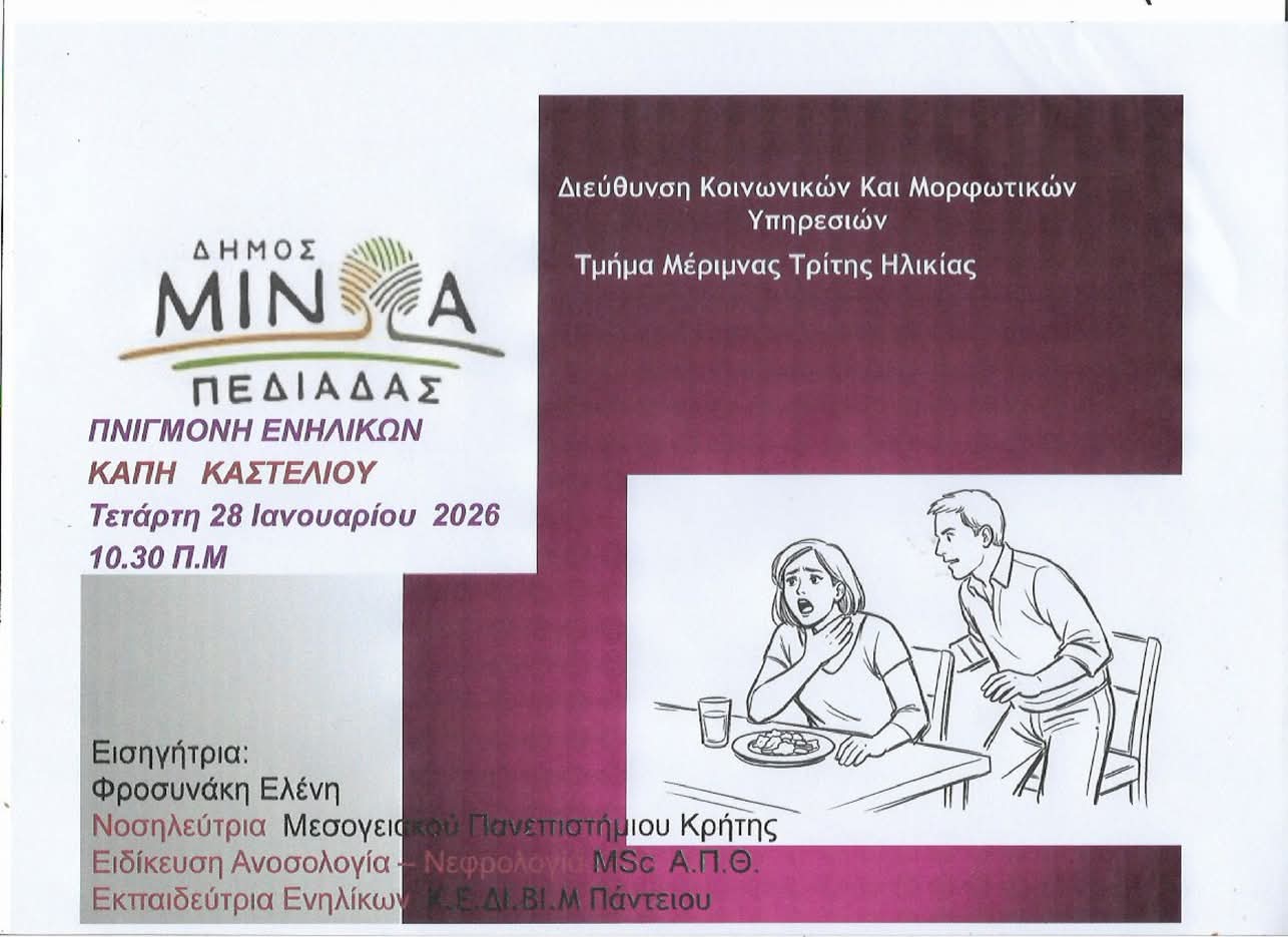 Ενημέρωση και εκπαίδευση στις Πρώτες Βοήθειες για την πνιγμονή ενηλίκων στο ΚΑΠΗ Αρκαλοχωρίου- Αντίστοιχη ενημέρωση την Τετάρτη 28 Ιανουαρίου στο ΚΑΠΗ Καστελλίου