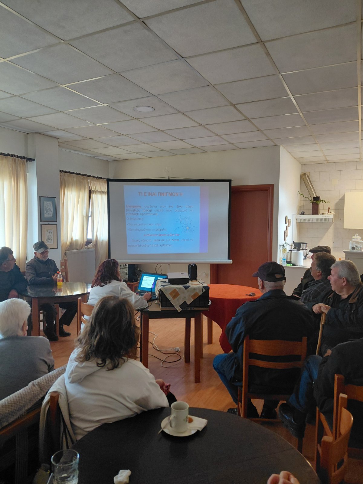 Η δράση απευθυνόταν στα μέλη του ΚΑΠΗ και είχε ως στόχο την απόκτηση βασικών γνώσεων και πρακτικών δεξιοτήτων, ώστε οι συμμετέχοντες να είναι σε θέση να αντιδρούν άμεσα και σωστά σε περιπτώσεις έκτακτης ανάγκης που σχετίζονται με την πνιγμονή.