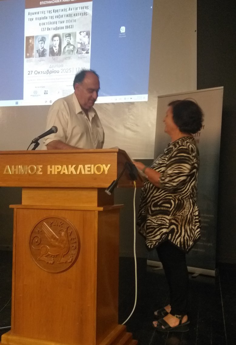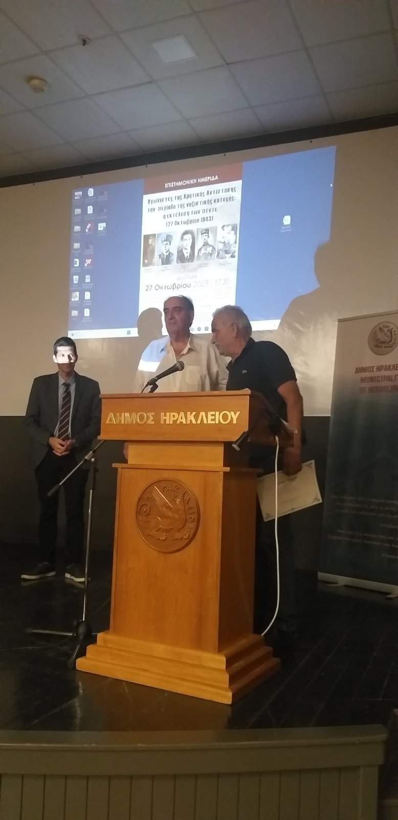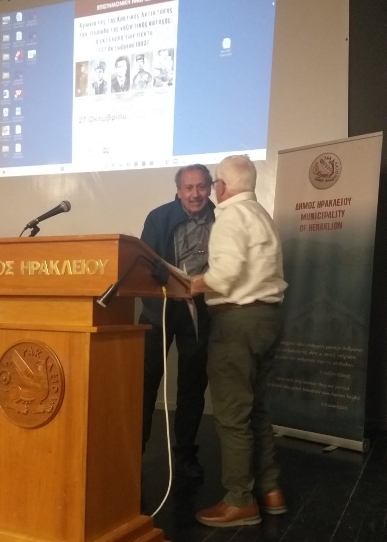 Μέσα σε κλίμα συγκίνησης, πραγματοποιήθηκε τη Δευτέρα 27 Οκτωβρίου, στην Αίθουσα «Μανώλη Καρέλλη» του Δήμου Ηρακλείου, η Επιστημονική Ημερίδα με θέμα: «Αγωνιστές της Κρητικής Αντίστασης την περίοδο της ναζιστικής κατοχής: η εκτέλεση των πέντε (27 Οκτωβρίου 1943)».