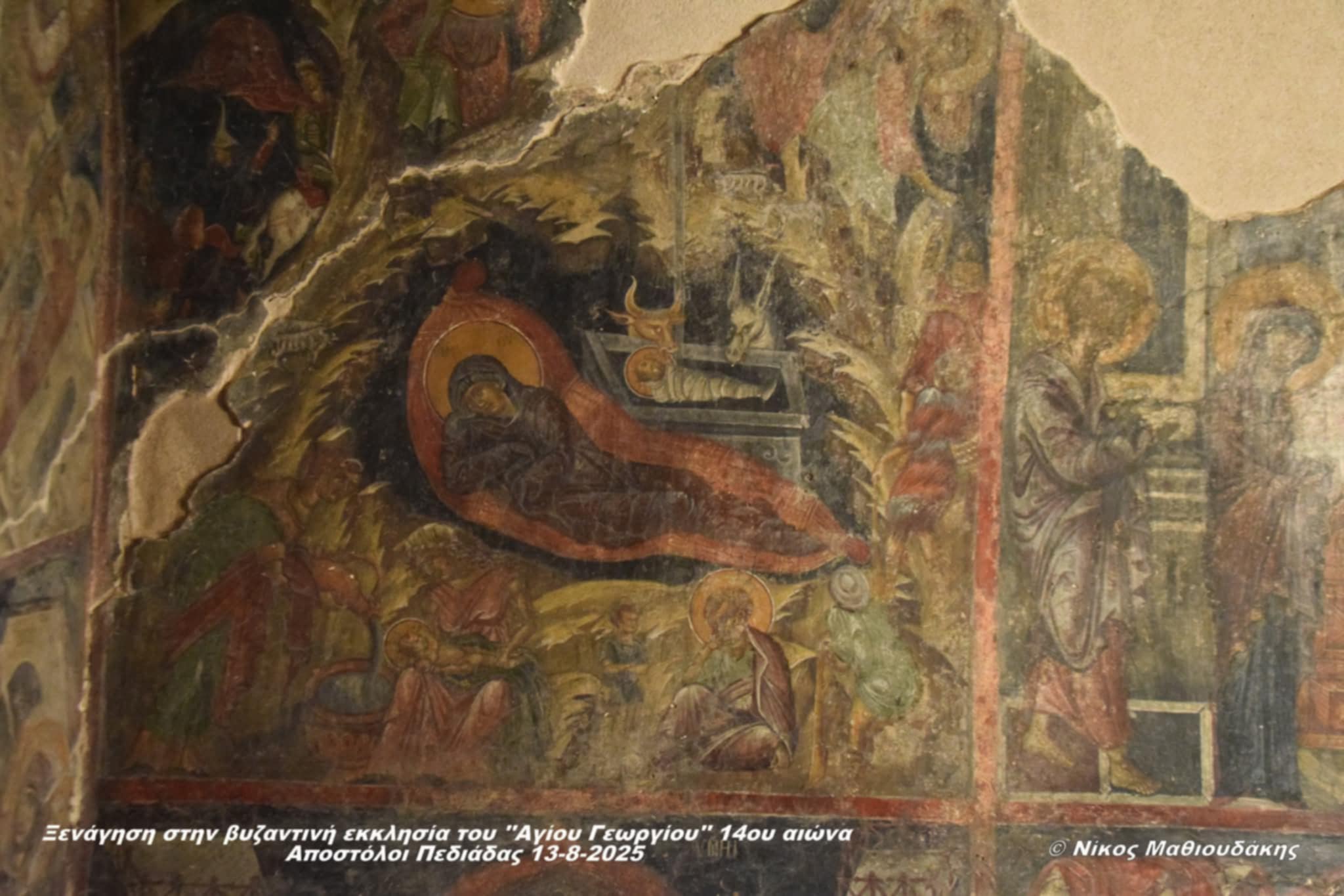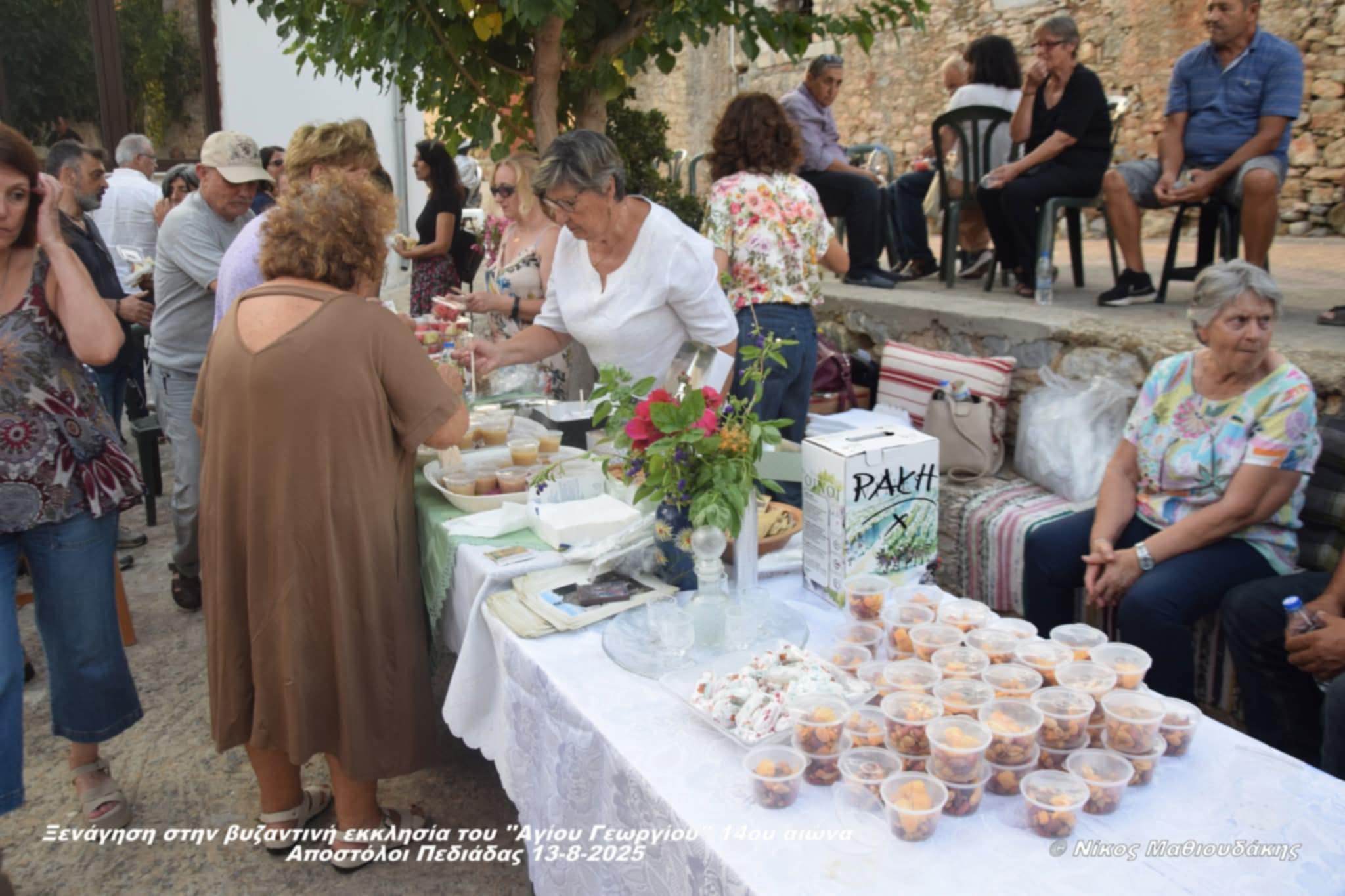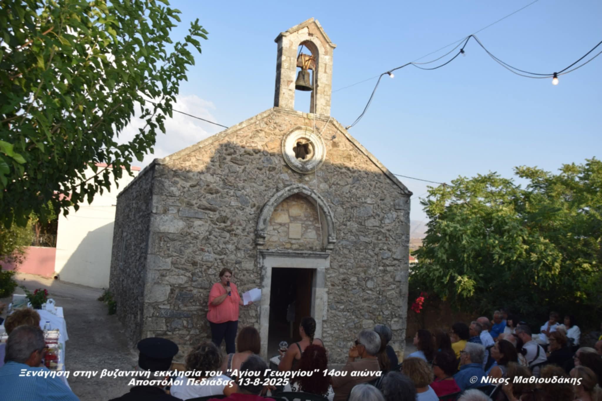 Αρχικά, πραγματοποιήθηκε ξενάγηση στη Βυζαντινή εκκλησία του Αγίου Γεωργίου, την οποία παρουσίασε η Αρχαιολόγος και Προϊσταμένη του Τμήματος Βυζαντινών & Μεταβυζαντινών Αρχαιοτήτων & Μουσείων της Εφορείας Αρχαιοτήτων Ηρακλείου Ελένη Κανάκη ενώ οι παρευρισκόμενοι είχαν την ευκαιρία να απολαύσουν ένα νόστιμο κέρασμα από τον Πολιτιστικό Σύλλογο Αποστόλων.