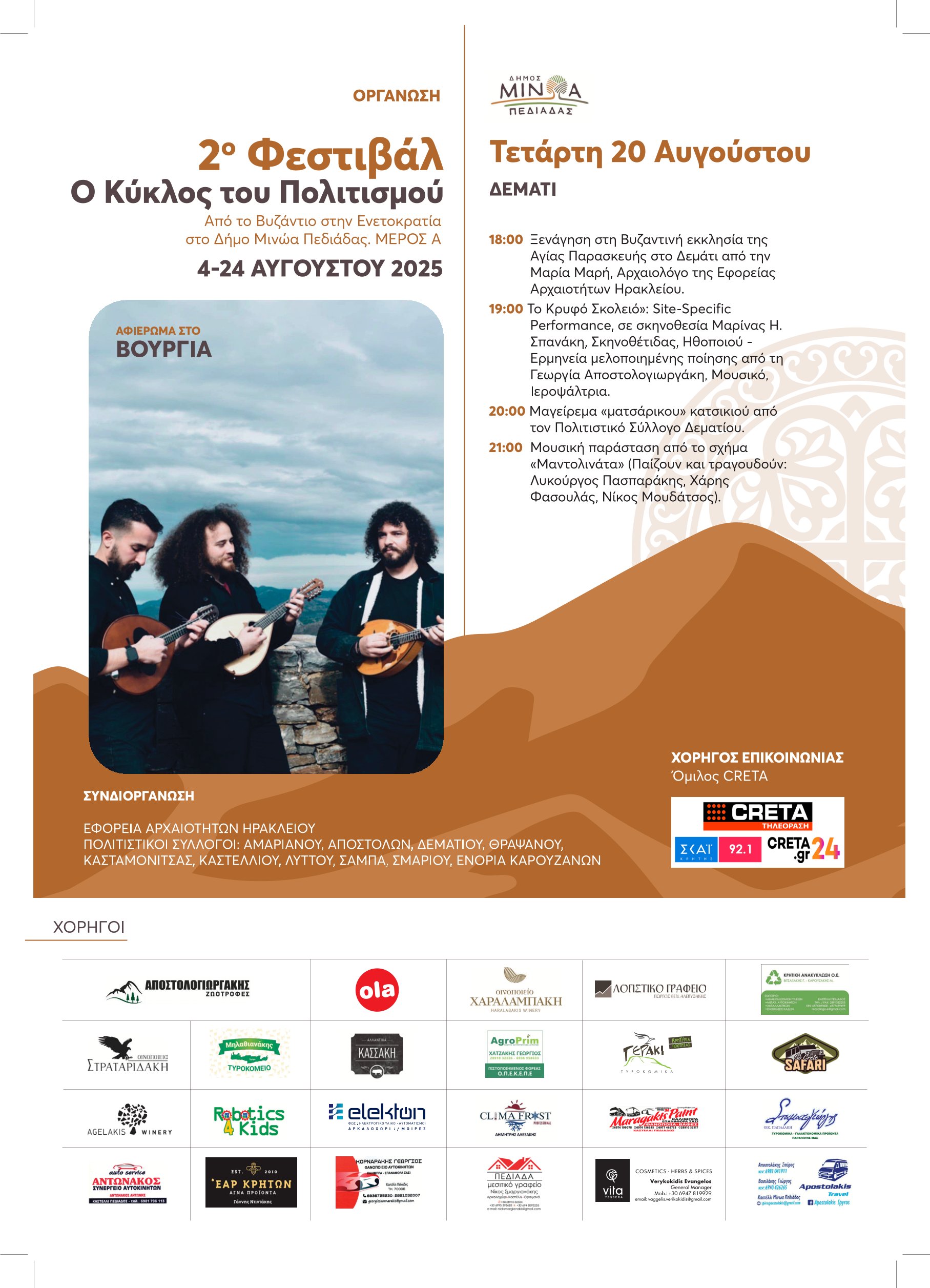 Συνδιοργάνωση: Εφορεία Αρχαιοτήτων Ηρακλείου, Πολιτιστικός Σύλλογος Δεματίου «Η Αγία Παρασκευή».