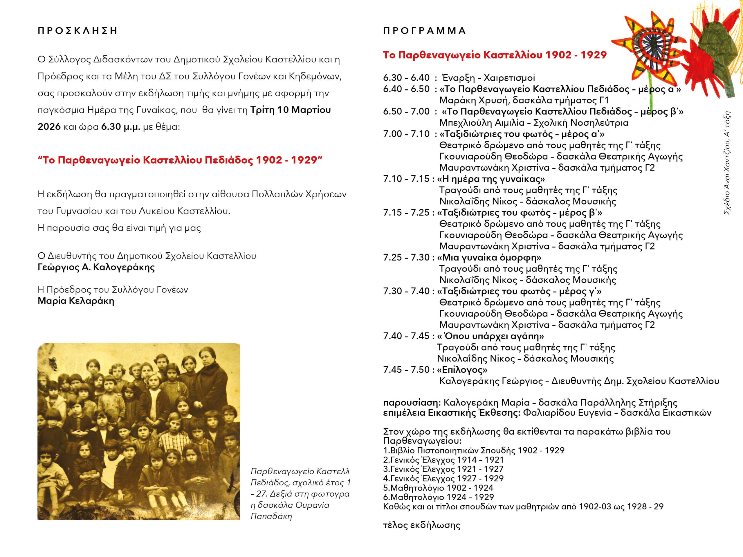 Το Παρθεναγωγείο Καστελλίου Πεδιάδος, 124 χρόνια από την ίδρυσή του- Εκδήλωση μνήμης αφιερωμένη στην Παγκόσμια Ημέρα της Γυναίκας από τους μαθητές της Γ΄ τάξης του Δημοτικού Σχολείου Καστελλίου,  την Τρίτη 10 Μαρτίου στις  6.30 μ.μ.
