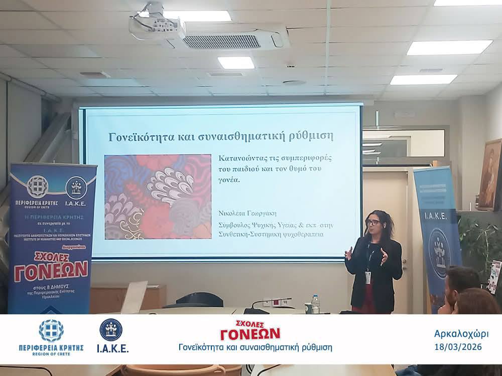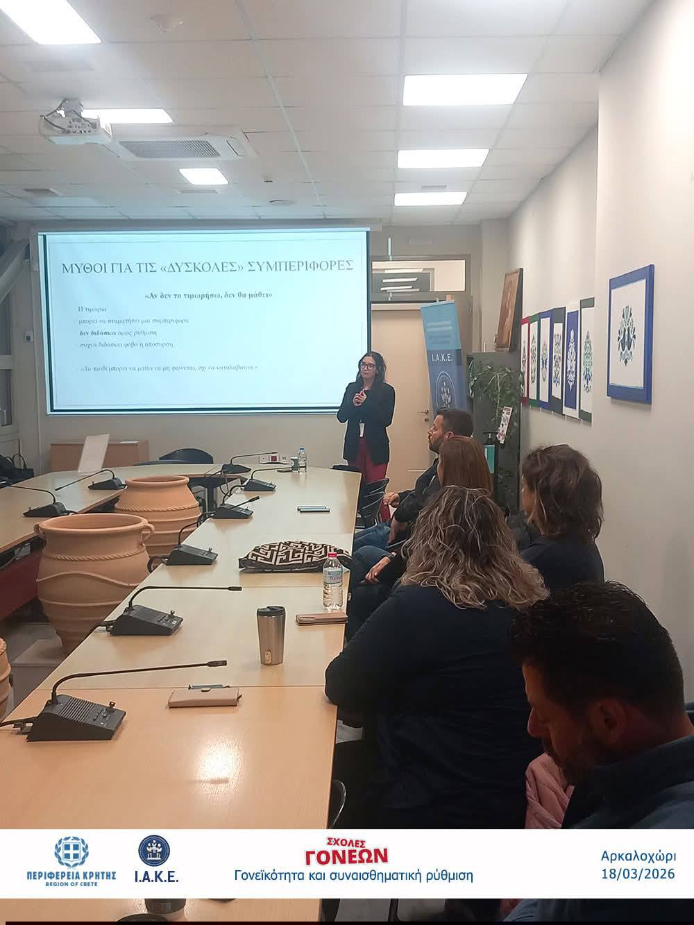 Την Τετάρτη 18 Μαρτίου 2026, στο Δημοτικό Κατάστημα Αρκαλοχωρίου του Δήμου Μινώα Πεδιάδας, πραγματοποιήθηκε συνάντηση της Σχολής Γονέων με θέμα: «Γονεϊκότητα και συναισθηματική ρύθμιση. Κατανοώντας τις συμπεριφορές του παιδιού και τον θυμό του γονέα».