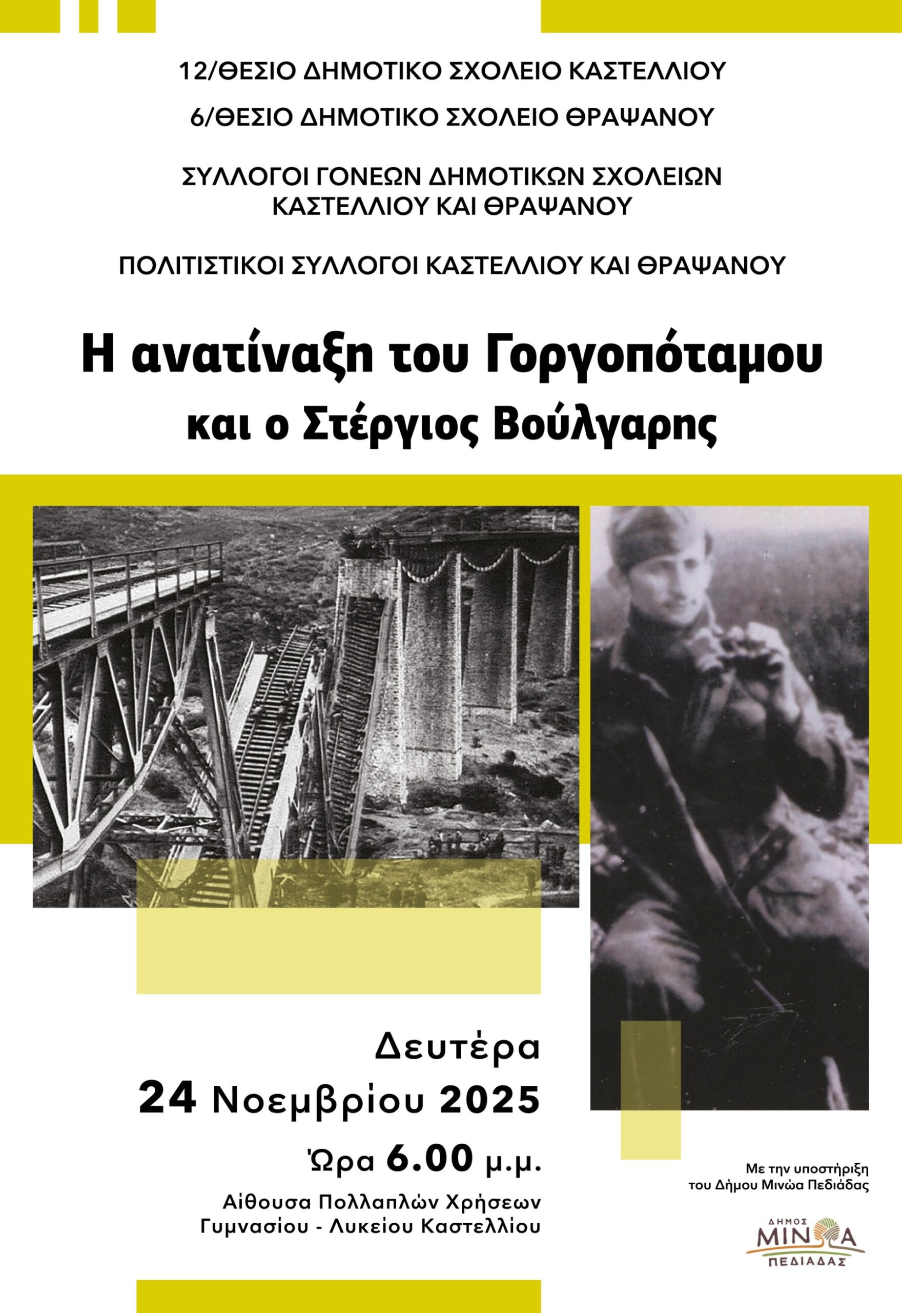 Η εκδήλωση με τίτλο, “Η ανατίναξη του Γοργοπόταμου και ο Στέργιος Βούλγαρης”, θα πραγματοποιηθεί στην αίθουσα Πολλαπλών Χρήσεων Γυμνασίου και Λυκείου Καστελλίου. Είναι αφιερωμένη στο μεγάλο ιστορικό γεγονός της ανατίναξης του Γοργοπόταμου από τους άντρες της ενωμένης Εθνικής Αντίστασης των Οργανώσεων του ΕΛΑΣ (Άρης Βελουχιώτης) και του ΕΔΕΣ (Ναπολέοντας Ζέρβας) και τελεί υπό την αιγίδα του Δήμου Μινώα Πεδιάδας. Στην εκδήλωση θα γίνει αναφορά στον Ηπειρώτη αντάρτη του ΕΔΕΣ Στέργιο Βούλγαρη από το χωριό Πηγές Άρτας, τη σχέση του με την Κρήτη και ειδικά με το Δήμο Μινώα Πεδιάδας.
