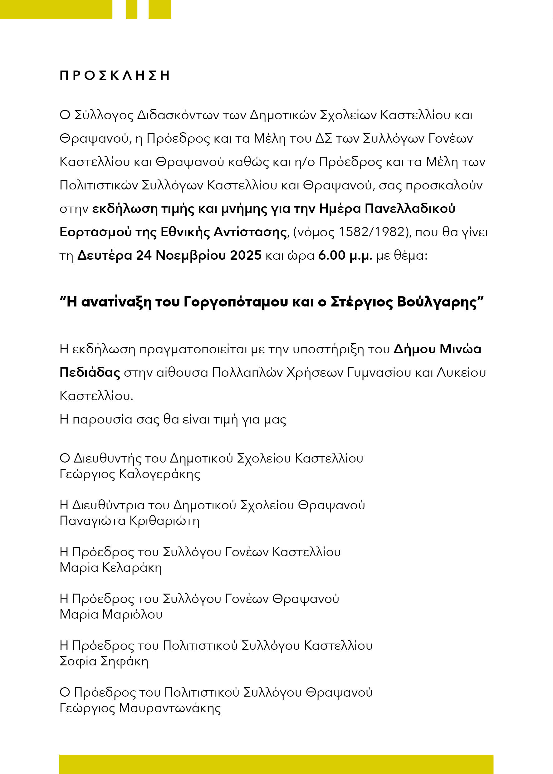 Τη Δευτέρα 24 Νοεμβρίου 2025 καις τις 6:00 το απόγευμα, τα Δημοτικά Σχολεία Καστελλίου και Θραψανού, οι Πολιτιστικοί Σύλλογοι Καστελλίου και Θραψανού, οι Σύλλογοι Γονέων των σχολείων Καστελλίου και Θραψανού καθώς και το Σχολείο Δεύτερης Ευκαιρίας Καστελλίου, διοργανώνουν εκδήλωση τιμής και μνήμης για την ημέρα του Πανελλαδικού εορτασμού της Εθνικής Αντίστασης (νόμος 1582/1982) και την 83η επέτειο της ανατίναξης του Γοργοπόταμου που πραγματοποιήθηκε στις 25/26 Νοεμβρίου 1942.