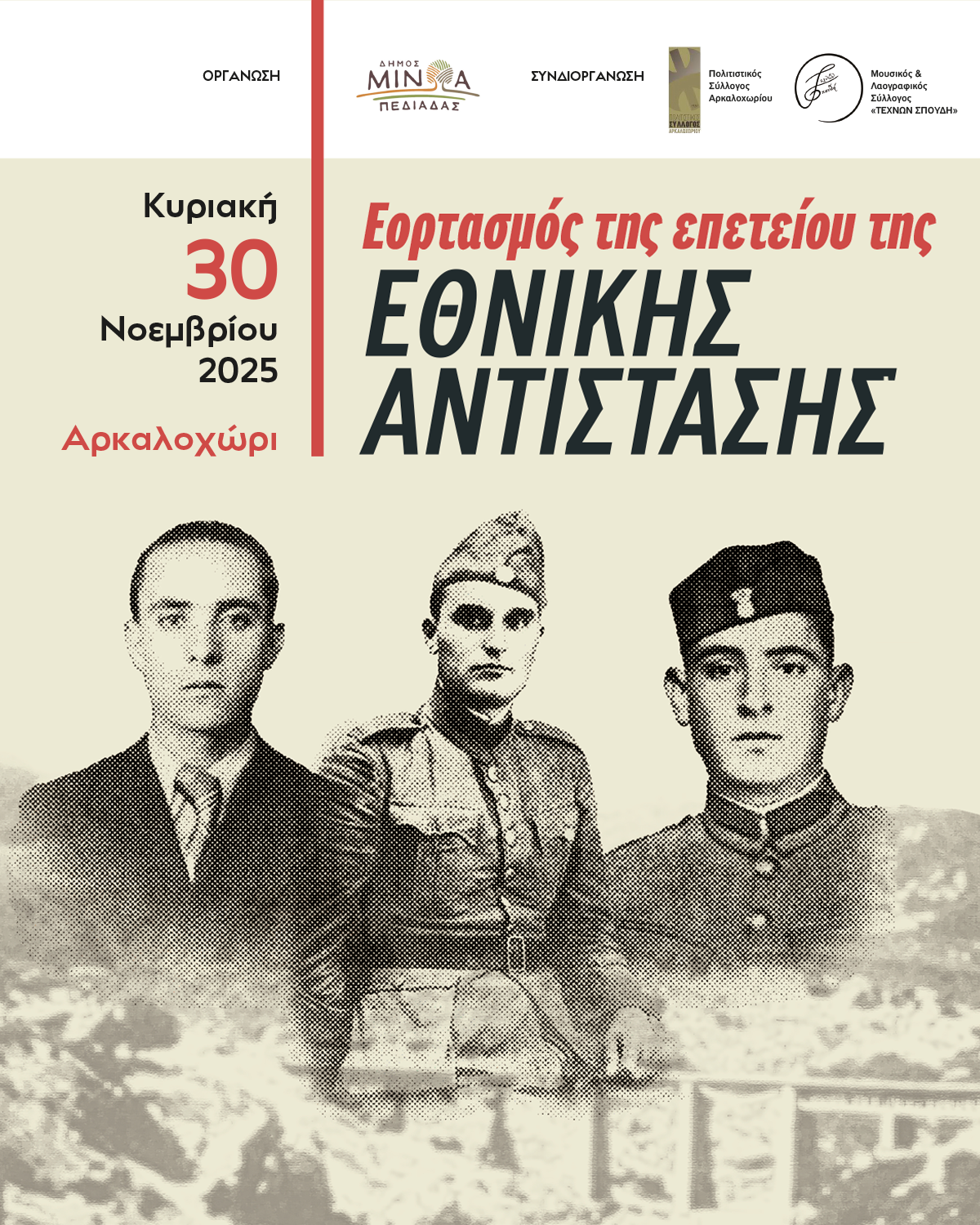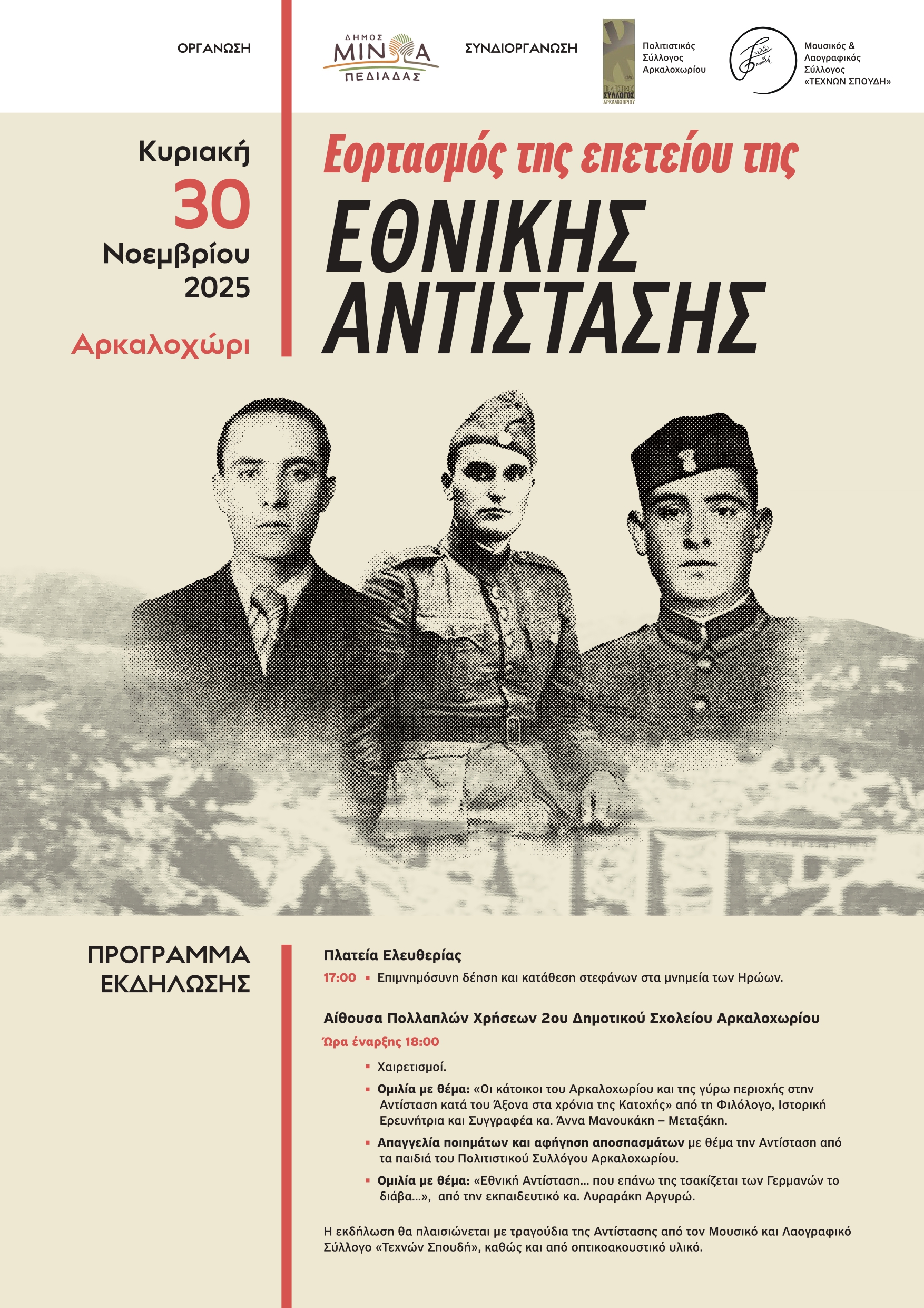 Ο Δήμος Μινώα Πεδιάδας τιμά και φέτος την Εθνική Αντίσταση, διοργανώνοντας εκδήλωση τιμής και μνήμης, την Κυριακή 30 Νοεμβρίου 2025, στο Αρκαλοχώρι.