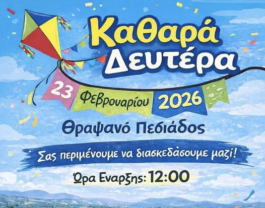 Με κέφι και αποκριάτικη διάθεση αναμένεται να γιορταστεί και φέτος η Καθαρά Δευτέρα στο Θραψανό του Δήμου Μινώα Πεδιάδας, τη Δευτέρα 23 Φεβρουαρίου 2026, στις 12 το μεσημέρι, σε μια εκδήλωση ανοιχτή για μικρούς και μεγάλους.