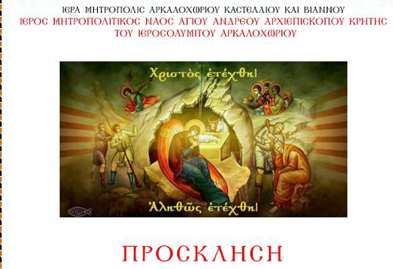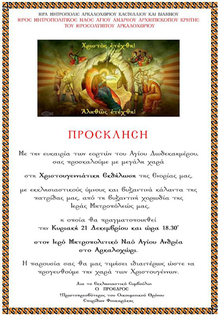 Η Ιερά Μητρόπολη Αρκαλοχωρίου, Καστελλίου και Βιάννου προσκαλεί το κοινό στη Χριστουγεννιάτικη εκδήλωση της Ενορίας του