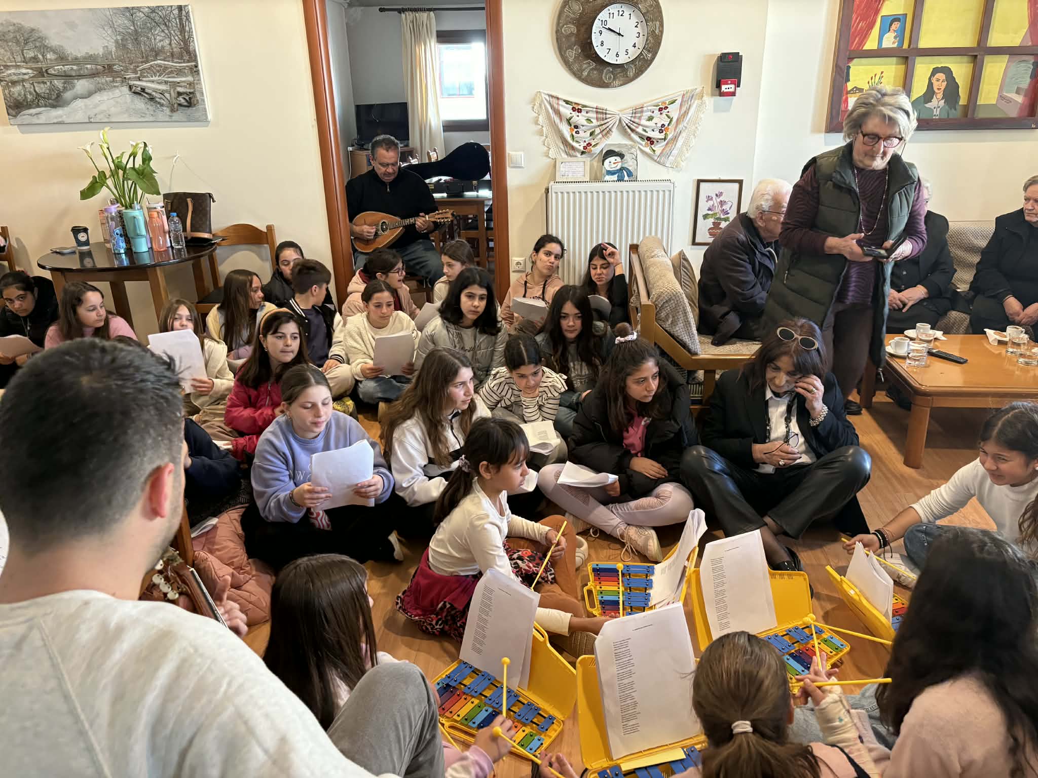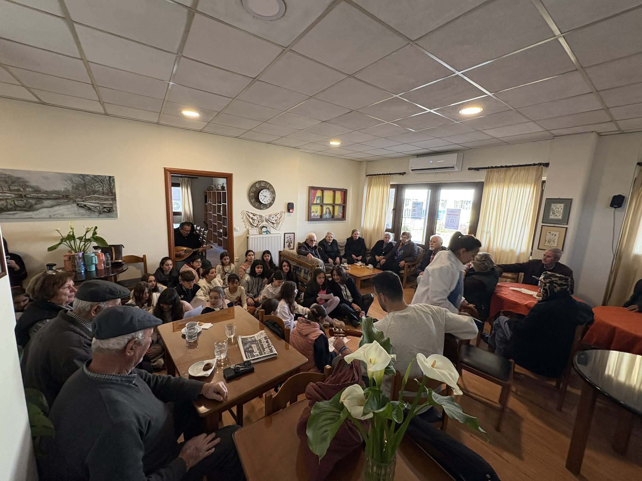 Τα παιδιά, με τη συνοδεία μουσικών οργάνων, τραγούδησαν μαζί με τα μέλη του ΚΑΠΗ αγαπημένα τραγούδια, σε μια όμορφη συνάντηση διαγενεακής επικοινωνίας που γέμισε συγκίνηση και χαρά όλους τους παρευρισκόμενους.