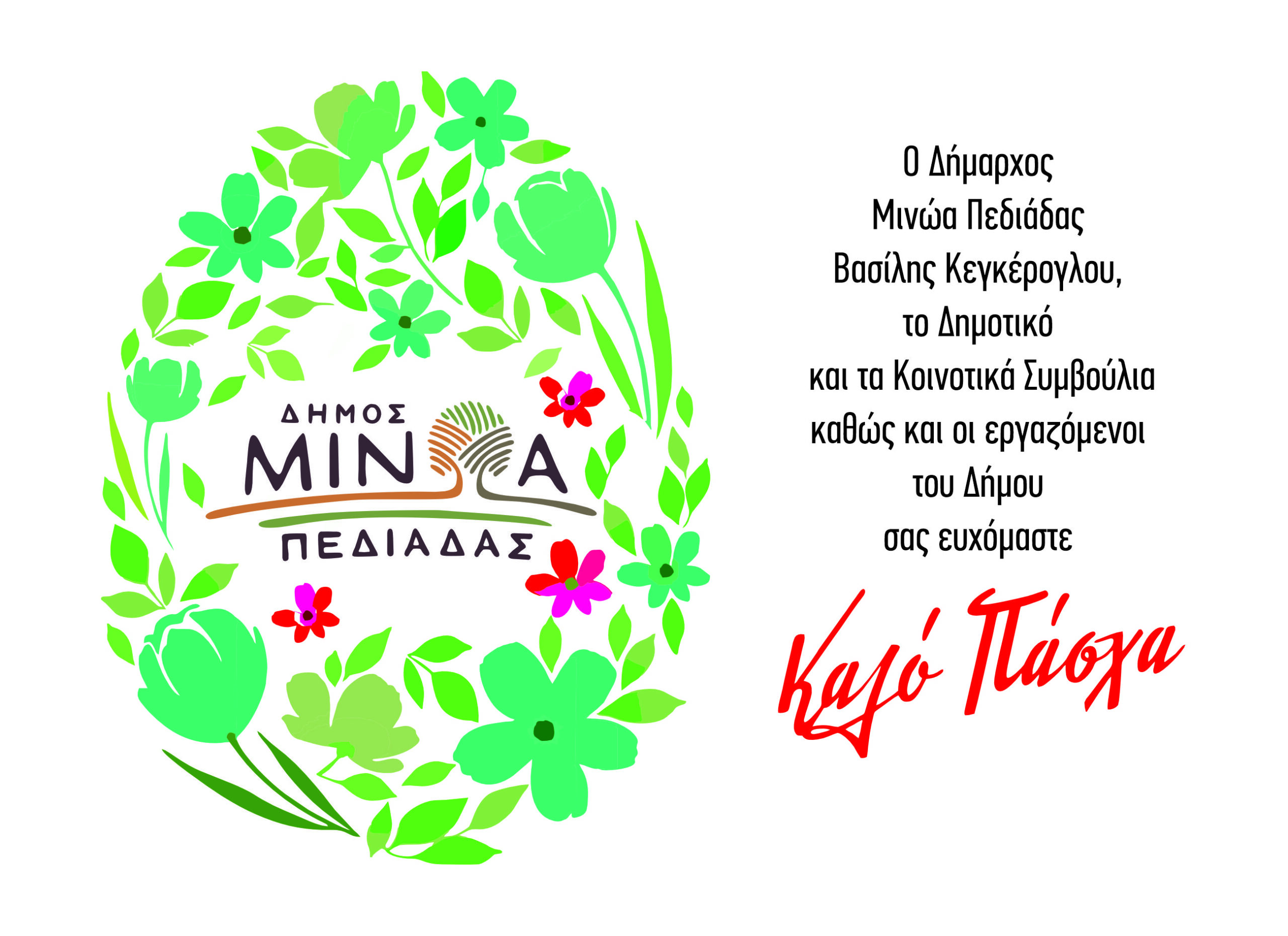 Ο Δήμαρχος Μινώα Πεδιάδας Βασίλης Κεγκέρογλου, το Δημοτικό Συμβούλιο καθώς και οι εργαζόμενοι του Δήμου, σας ευχόμαστε Καλό Πάσχα!