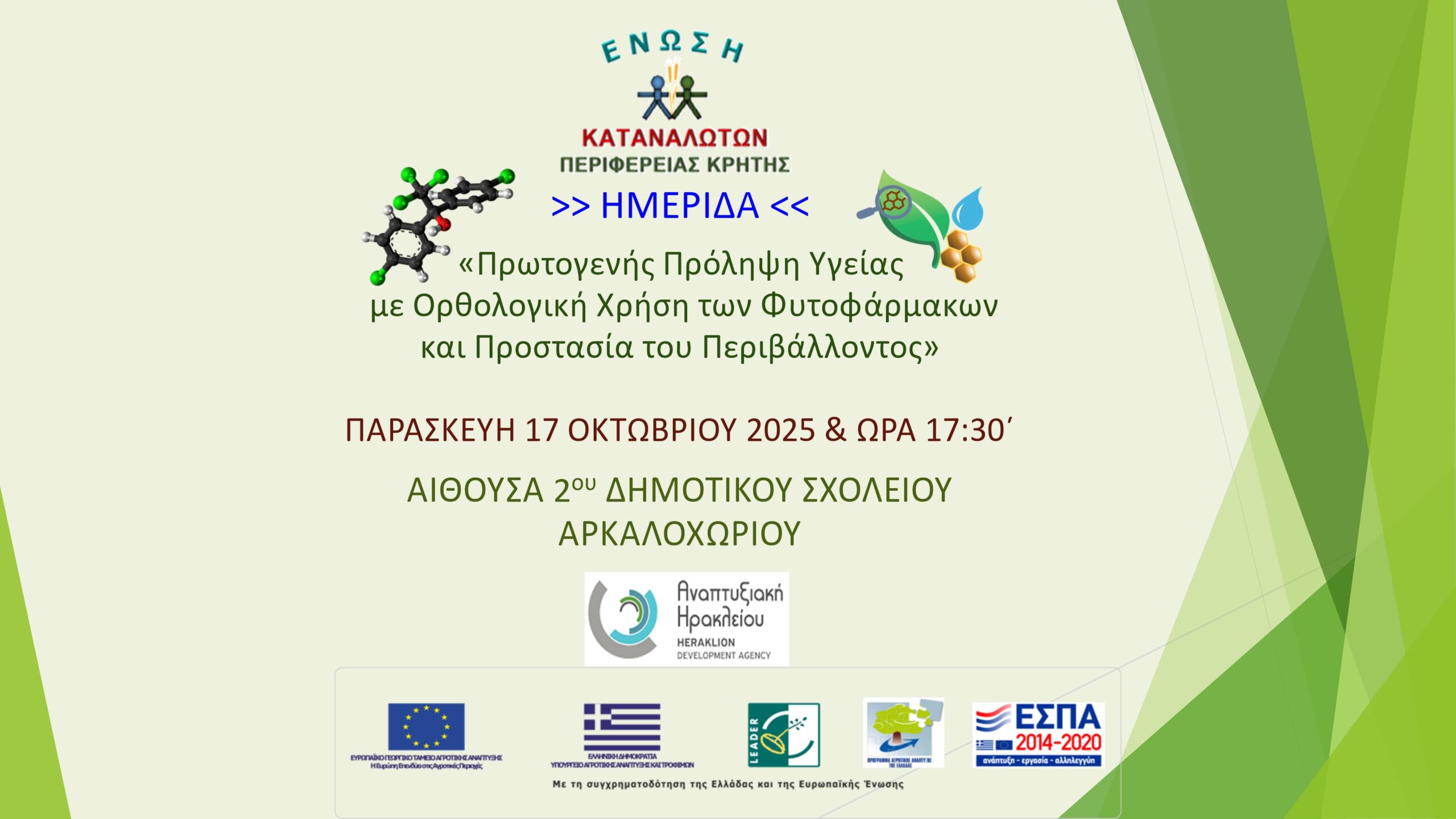 Η Ένωση Καταναλωτών Περιφέρειας Κρήτης πραγματοποιεί ενημερωτική ημερίδα με θέμα “Πρωτογενής πρόληψη υγείας με ορθολογική χρήση των φυτοφαρμάκων και προστασία του περιβάλλοντος”, την Παρασκευή 17 Οκτωβρίου 2025 και ώρα 17:30 στην Αίθουσα του 2ου Δημοτικού Σχολείου Αρκαλοχωρίου