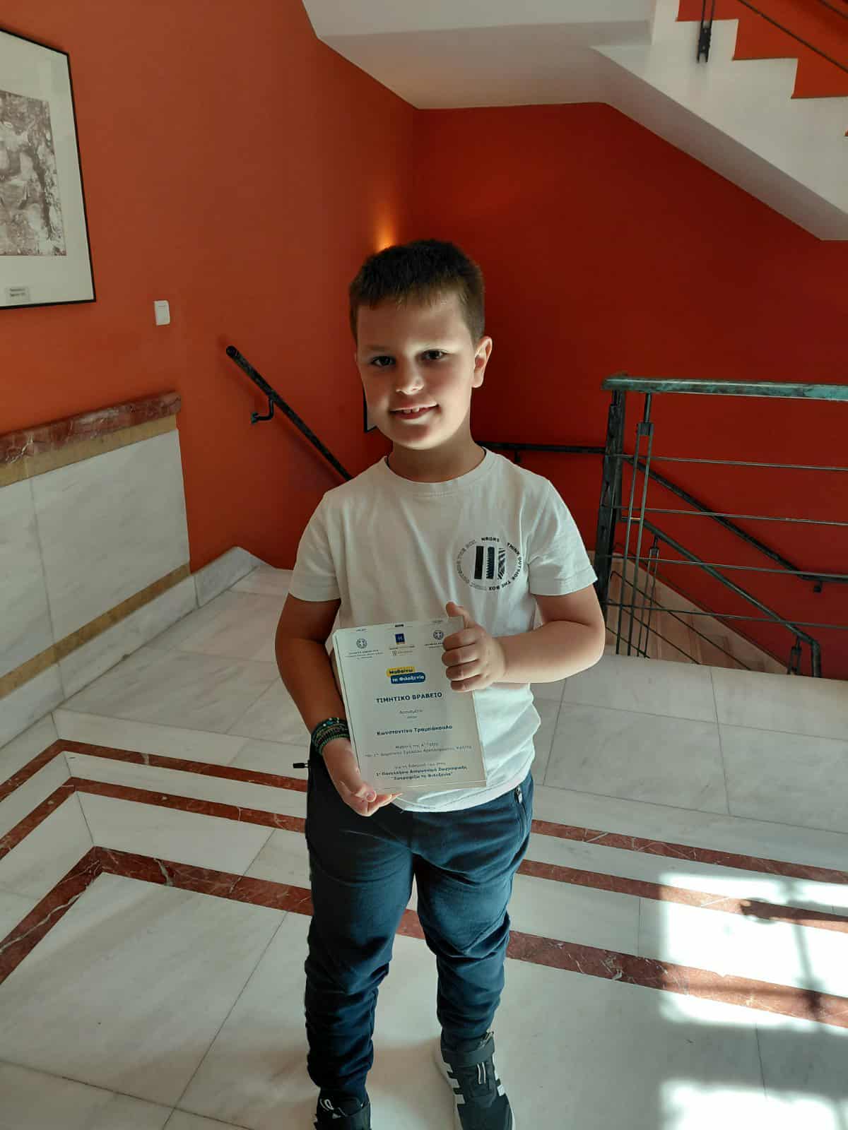 Ο μικρός Κωνσταντίνος, ο οποίος πέρυσι ως μαθητής της Α’ Δημοτικού συμμετείχε στον 1ο Πανελλήνιο Μαθητικό Διαγωνισμό Ζωγραφικής του Ξενοδοχειακού Επιμελητηρίου Ελλάδος (ΞΕΕ) με θέμα «Ζωγραφίζω τη Φιλοξενία», κατάφερε να ξεχωρίσει ανάμεσα σε 2.300 συμμετοχές από όλη την Ελλάδα και να είναι ένας από τους 18 νικητές (3 παιδιά ανά τάξη) του διαγωνισμού (ο μοναδικός σε επίπεδο Νομού Ηρακλείου). Η διάκριση του αποτελεί ένα δυνατό μήνυμα έμπνευσης, ελπίδας και δημιουργικότητας, ενώ αξίζει να σημειωθεί ότι η βράβευση από την Υπουργό Παιδείας Σοφίας Ζαχαράκη και Τουρισμού Όλγα Κεφαλογιάννη, πραγματοποιήθηκε το Σάββατο 27 Σεπτεμβρίου, ανήμερα της συμπλήρωσης 4 χρόνων από τον καταστροφικό σεισμό του 2021 που έπληξε την περιοχή.