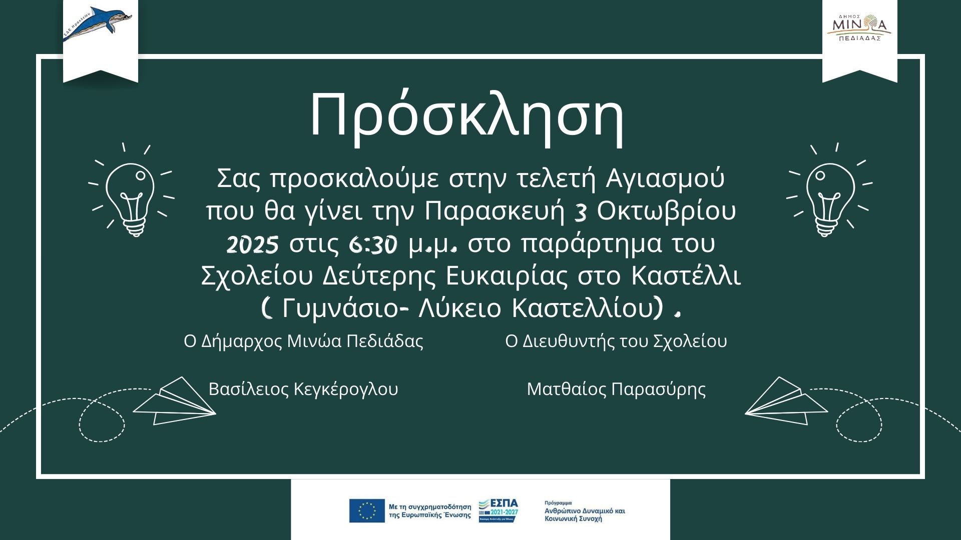 Ο Δήμαρχος Μινώα Πεδιάδας Βασίλης Κεγκέρογλου και ο Διευθυντής του Σχολείου Δεύτερης Ευκαιρίας Ηρακλείου Ματθαίος Παρασύρης, σας προσκαλούν στην τελετή Αγιασμού που θα πραγματοποιηθεί την Παρασκευή 3 Οκτωβρίου, στις 6:30 μ.μ. 2025, στο παράρτημα του Σχολείου Δεύτερης Ευκαιρίας στο Καστέλλι (Γυμνάσιο-Λύκειο Καστελλίου) του Δήμου Μινώα Πεδιάδας.