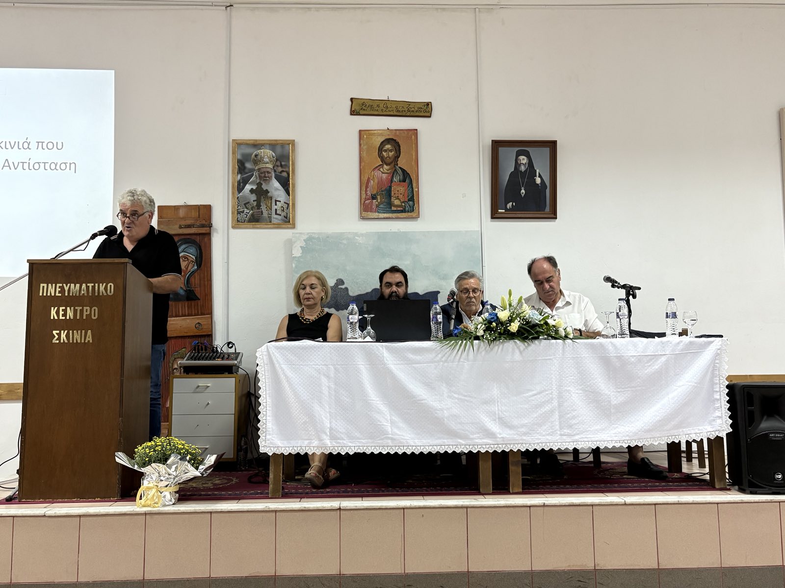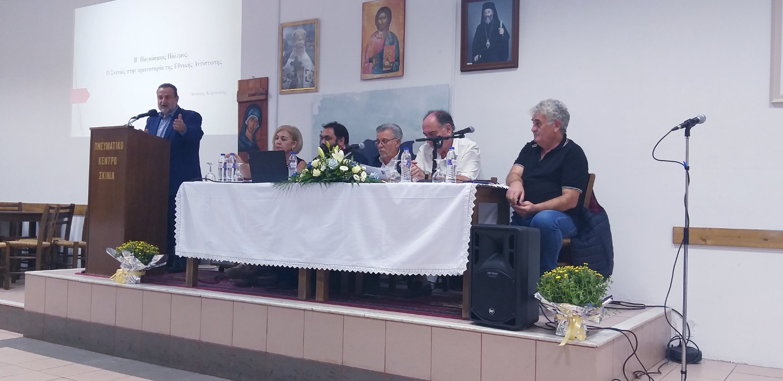 Μετά τους χαιρετισμούς από την Πρόεδρο του Πολιτιστικού Συλλόγου Σκινιά Καλλιόπη Μπριτζολάκη και τον Πρόεδρο της Δημοτικής Κοινότητας Σκινιά Εμμανουήλ Νικολουδάκη ακολούθησε ομιλία από τη Μαρία Γαλανάκη, δασκάλα του 46ου Δημοτικού Σχολείου Ηρακλείου, με τίτλο: Δεκατρεις (13) Γυναίκες του Σκινιά στην Εθνική Αντίσταση και οι ομιλίες «Σκινιανοί Αντιστασιακοί» από τον Γεώργιο Σηφάκη, συντ. εκπαιδευτικό, «Ο Εμμανουήλ Παπαδημητρόπουλος προς τον Καπετάν Μανώλη Μπαντουβά» από τον Παπά Μιχάλη Παπαϊωάννου, ιερέα της Ενορίας Αγίου Παντελεήμονος Νιπιδιτού και τέλος, «Ο Ελληνικός Μυστικός Ασύρματος στην Κρήτη» από τον Γεώργιο Α. Καλογεράκη, Δρ. Πανεπιστημίου Ιωαννίνων, Πρόεδρο του Δημοτικού Συμβουλίου Δήμου Μινώα Πεδιάδας και Διευθυντή του Δημοτικού Σχολείου Καστελλίου, εισηγήσεις που ανέδειξαν άγνωστες, ιστορικές και ηρωικές πράξεις, κατοίκων του Σκινιά.
