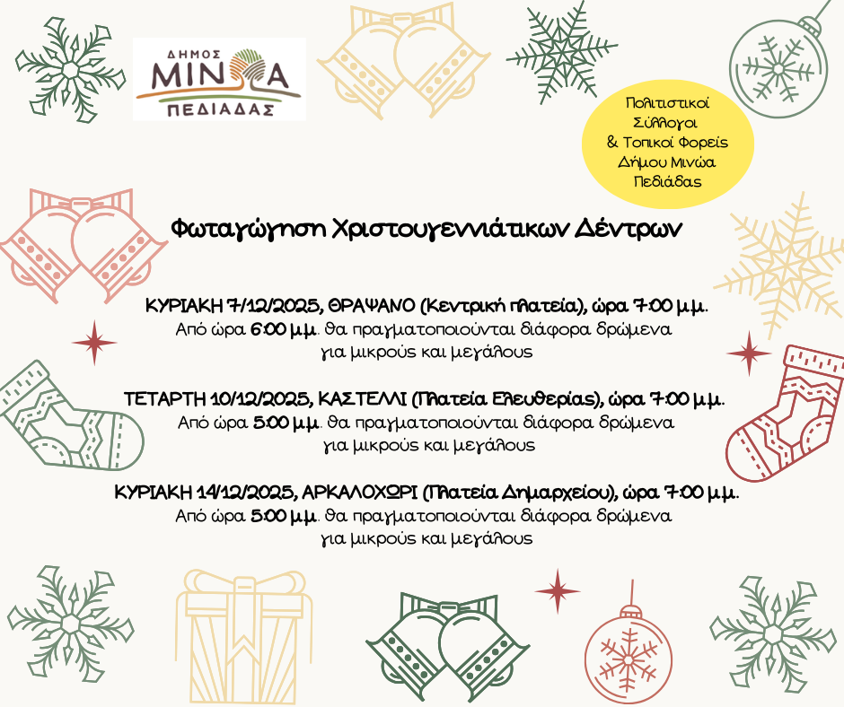 Τα Χριστούγεννα ετοιμάζεται να υποδεχτεί ο Δήμος Μινώα Πεδιάδας, αρχής γενομένης με τη φωταγώγηση των χριστουγεννιάτικων δέντρων που θα πραγματοποιηθούν στα κέντρα των τριών Δημοτικών Ενοτήτων του Δήμου και πιο συγκεκριμένα στο Θραψανό την Κυριακή 7 Δεκεμβρίου, στο Καστέλλι την Τετάρτη 10 Δεκεμβρίου και στο Αρκαλοχώρι την Κυριακή 14 Δεκεμβρίου 2025, σε συνεργασία με τους Πολιτιστικούς Συλλόγους και τοπικούς φορείς του Δήμου.
