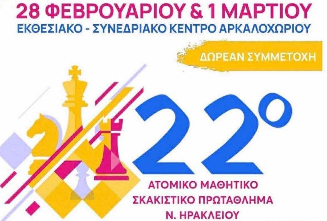 Αντίστροφη μέτρηση για το 22ο Ατομικό Μαθητικό Σκακιστικό Πρωτάθλημα Νομού Ηρακλείου που θα πραγματοποιηθεί το Σάββατο 28 Φεβρουαρίου και την Κυριακή 1 Μαρτίου 2026, στο Εκθεσιακό – Συνεδριακό Κέντρο Αρκαλοχωρίου.