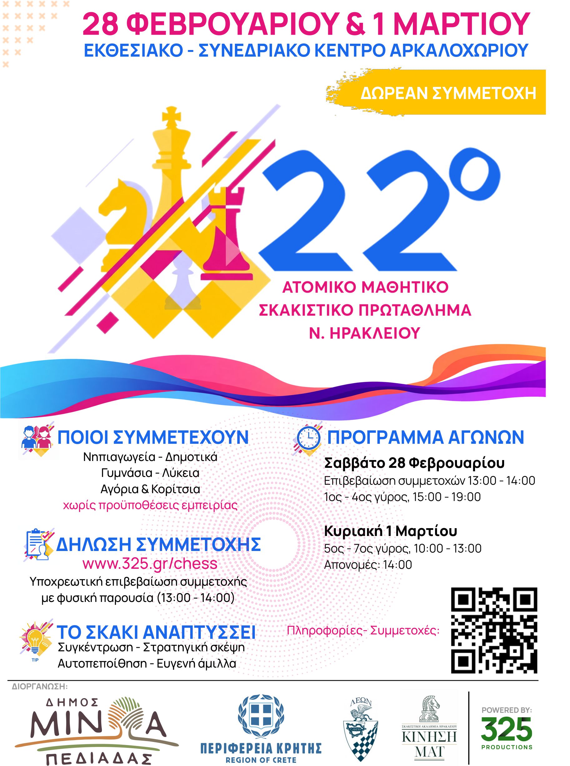 Η μεγαλύτερη μαθητική σκακιστική διοργάνωση της Κρήτης, αναμένεται να συγκεντρώσει περίπου 500 μαθητές και μαθήτριες από όλο το Νομό Ηρακλείου, από το Νηπιαγωγείο έως και τη Γ’ Λυκείου, καθώς και εκατοντάδες συνοδούς και επισκέπτες. Η συμμετοχή είναι δωρεάν και ανοιχτή σε όλα τα παιδιά που γνωρίζουν τα βασικά του σκακιού.